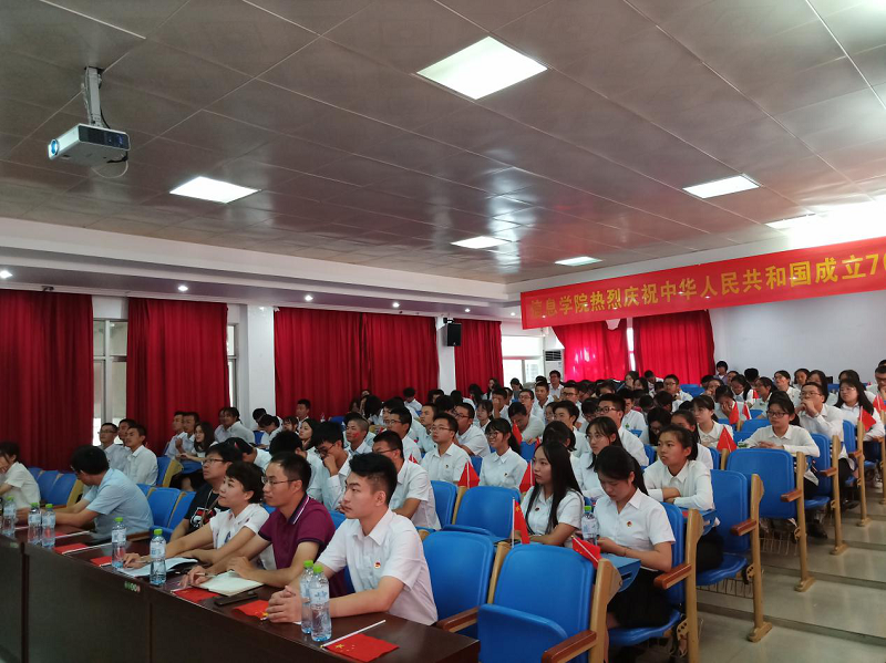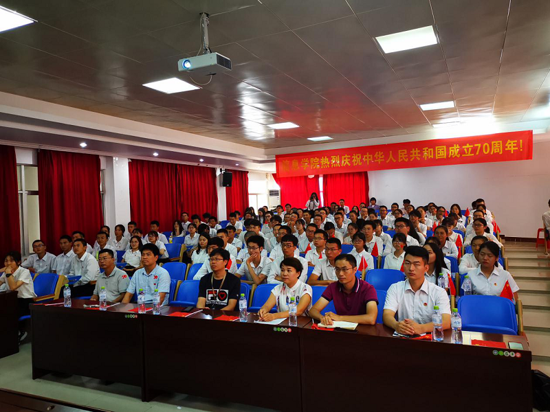 壮阔七十载,奋进新时代。10月1日上午,庆祝中华人民共和国成立70周年大会在北京天安门广场隆重举行,20余万军民以盛大的阅兵仪式和群众游行欢庆共和国70华诞。为了增强我院师生的家国情怀和民族自豪感,学院于10月1号早上8:30组织师生党员、团学干部、学生代表150余人在学院报告厅全程观看庆祝大会,学院党委书记蒙秋妍,院长黄梦醒,副院长任佳、李晖,辅导员李忠老师等一同参加了此次活动。学院党委副书记王茂钢带领27名同学在思源大礼堂观看大会直播。