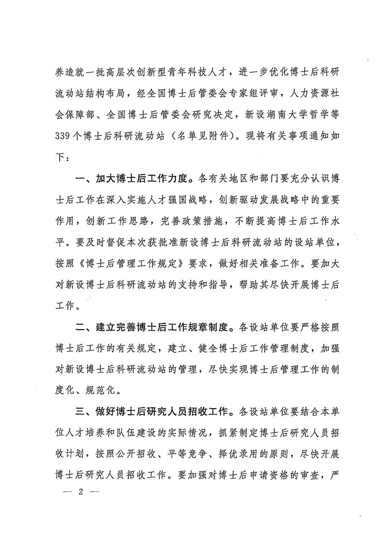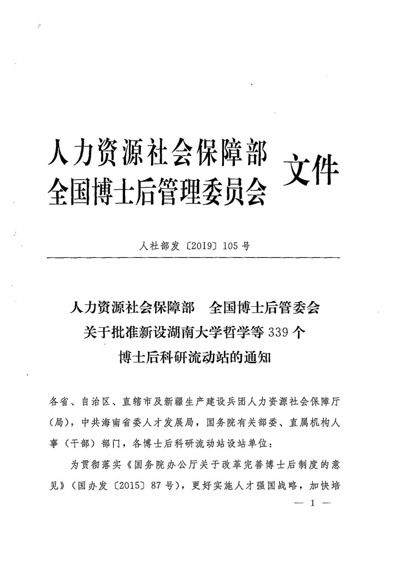 2019年9月27日,人力资源社会保障部、全国博士后管委会联合下发《人力资源社会保障部 全国博士后管委会关于批准新设湖南大学哲学等339个博士后科研流动站的通知》(人力资源和社会保障部发〔2019〕105号),经全国博士后管委会专家组评审,人力资源社会保障部、全国博士后管委会研究决定,批准我院信息与通信工程一级学科设立博士后科研流动站。