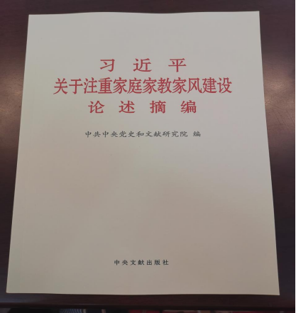 会上下发了《习近平关于注重家庭家教家风建设论述摘编》一书,该书分7个专题,共计107段论述,摘自习近平同志2012年11月15日至2020年12月28日期间的报告、讲话、谈话、说明、答问等60多篇重要文献,大家进行了认真学习。
