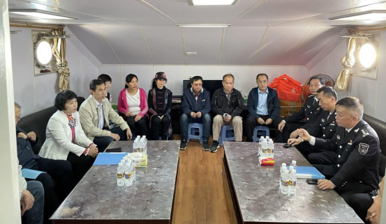 签约仪式后,在海口市综合行政执法局海洋和渔业行政执法支队领导的陪同下,学院教师乘坐中国渔政46029船调研海口市海岸线、海洋开发项目、行政执法、渔港渔船分布等情况。冯所军支队长带领大家参观了支队渔业指挥中心,对目前支队使用的现有执法监管设备进行了介绍,详细讲述了在执法应用中存在的难点问题,希望借助高校科研优势深入研究解决。