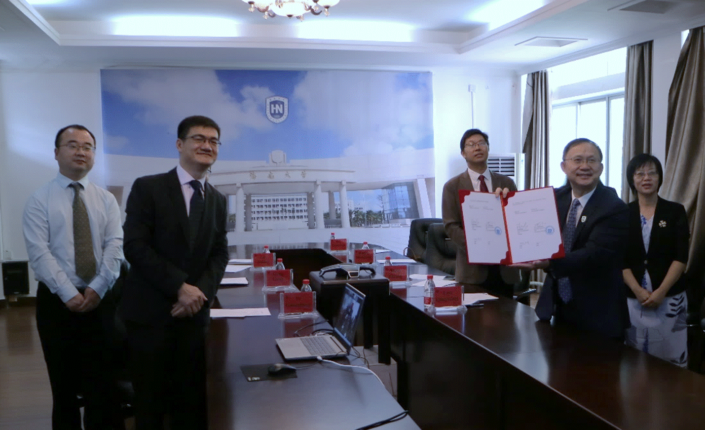 签约仪式由怀卡托大学Alister教授主持开场,并与我校杨志昕处长一起介绍参会人员。海南大学校长骆清铭随后致辞并表示我校对此次与新西兰怀卡托大学合作办学项目高度重视,希望通过该项目促进两校在师资、学生、科研等多方面合作与交流。新西兰怀卡托大学校长Neil Quigley也紧接着发表致辞表达了对此次合作办学项目的期待,以及与海南大学前期合作的充分肯定。最后,在所有参会人员的共同见证下,海南大学校长骆清铭和怀卡托大学校长Neil Quigley 共同签署了合作协议并合影。