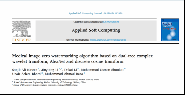 近日,海南大学信息与通信工程专业巴基斯坦籍博士留学生Saqib Ali Nawaz(高兴),在计算机科学TOP期刊《Applied Soft Computing》(中科院一区)在线发表了题为:《Medical Image Zero Watermarking Algorithm based on dual-tree complex wavelet transform, AlexNet and discrete cosine transform》的论文,提出了一种旨在保护敏感健康信息的医学图像零水印新算法。Saqib Ali Nawaz(高兴)为第一作者,402cc永利集团,402cc永利官网,402永利集团官网入口李京兵教授为通讯作者。