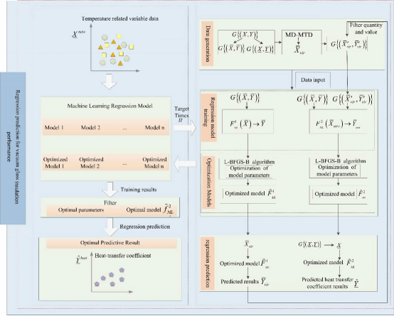 如图2,论文基于多变量数据筛选和多模型融合的自寻优回归方法被提出,用于真空玻璃保温性能的回归预测。在自寻优结构中结合了多分布整体扩散技术,生成了虚拟样本数据解决了样本量不足的问题。为保证模型的准确性,对生成的数据进行数量和阈值筛选,以增强虚拟样本数据的有效性。引入了L-BFGS-B算法优化多个模型的参数,进一步提高模型回归预测的准确性。最后,通过自寻优框架结构更新虚拟样本数据筛选和各种模型参数的优化。从多个模型中确定了预测真空玻璃绝缘性能传热系数的最佳模型。为验证自寻优回归方法的有效性,在30种不同方式下进行了真空玻璃保温性能传热系数预测实验。实验结果表明,基于多变量数据筛选和多模型融合的自寻优回归方法可以获得最有效的回归预测模型,实现真空玻璃保温性能的准确、快速和智能预测。
