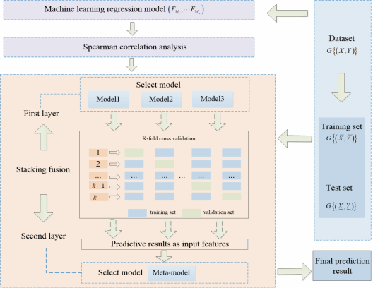 如图1,论文结合机器学习和先验信息提出了3+1 Stacking智能快速检测模型,通过斯皮尔曼相关性分析和5折交叉验证构成了堆叠模型的结构体系,有效地选择了模型组合策略,从而保证预测模型的准确性。这种模型融合结构简单,层次结构选择清晰,可通过多个模型对真空玻璃小样本数据中的特征的学习得到表征真空玻璃保温性能的传热系数。实验结果表明,提出的 3+1 Stacking模型与当前真空玻璃保温性能预测模型相比,表现出更加优越的性能。