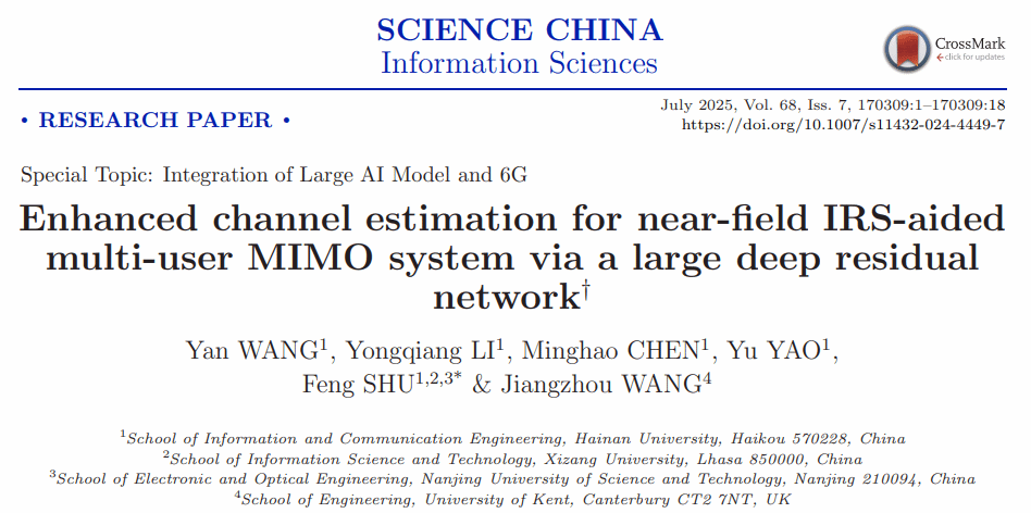 近日,402永利集团官网入口束锋教授团队在《SCIENCE CHINA Information Sciences》(中科院一区TOP期刊,CCF A刊,影响因子为7.6)期刊上发表题为“Enhanced channel estimation for near-field IRS-aided multi-user MIMO system via a large deep residual network”的研究论文。402永利集团官网入口2022级博士生王艳为文章第一作者,束锋教授为通信作者,海南大学为第一单位。